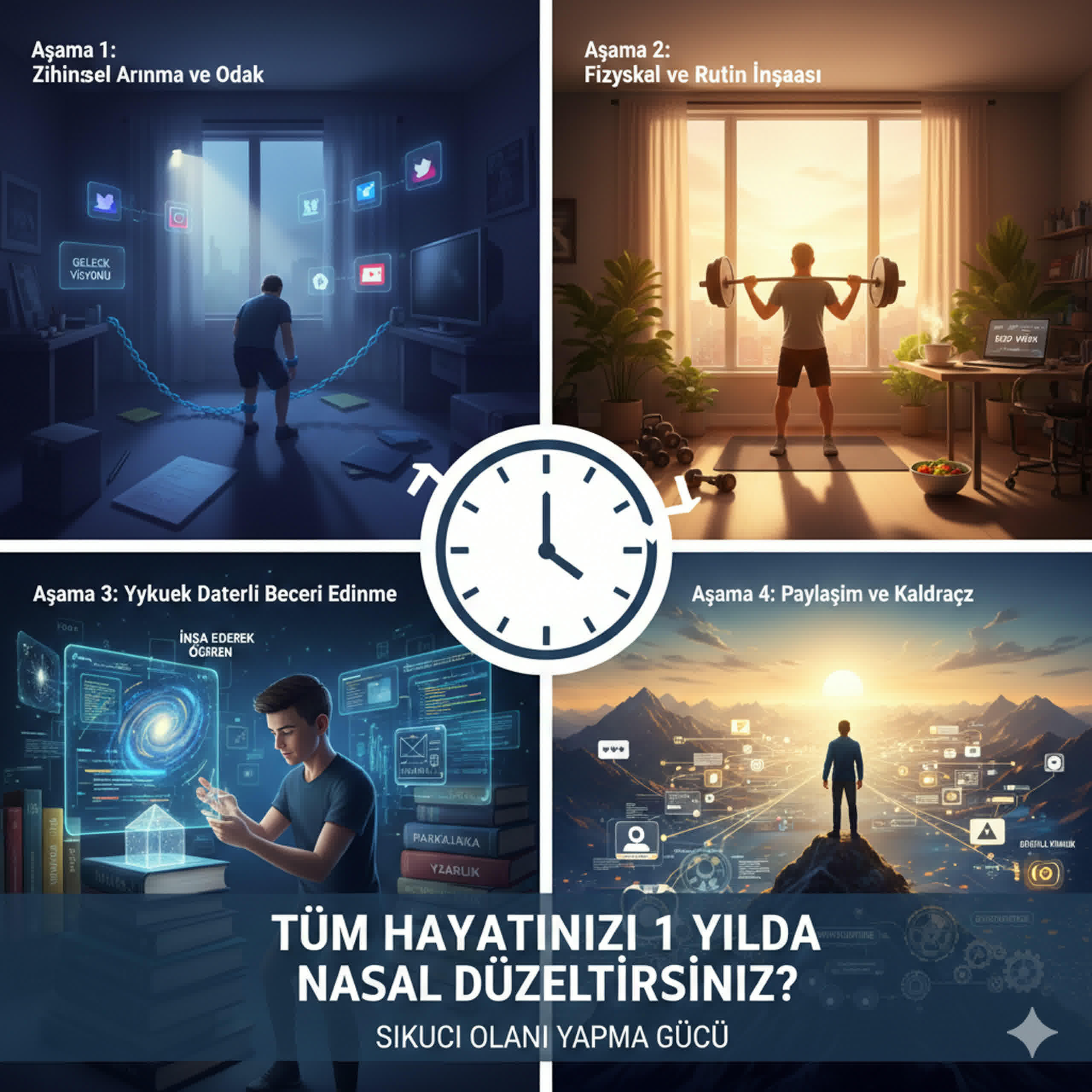 Hayatınızı düzeltmek dışsal bir mucize beklemek değil, zihninizi kontrol altına almak, bedeninize bakmak ve her gün tutarlı bir şekilde bir şeyler inşa etmektir. 1 yıl boyunca her gün kendinizi %1 geliştirirseniz, yıl sonunda bambaşka bir insan olursunuz.